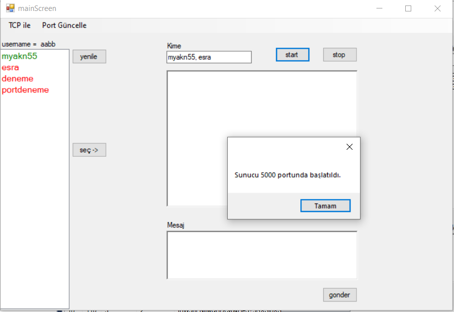 start butonu ile listener eventi başlatılıyor ve 5000 portundan dinleme yapılabiliyor. Eğer bunu yapmadan karşı taraftan mesaj almaya çalışırsak karşı tarafın mesajı bize ulaşamıyor.