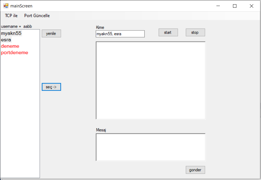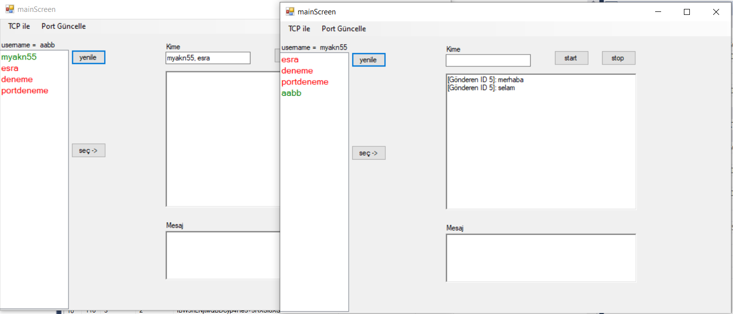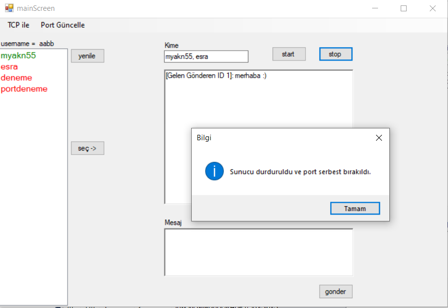 Stop butonu ile dinlemeye başladığımız portu serbest bırakabiliyoruz, bunu yapma amacımız iki farklı kullanıcı aynı portu dinleyemiyor TCP buna izin vermiyor. başka bir kullanıcı daha aynı port değerine sahipse start komutunu bastığında hata mesajıyla karşılaşıyor. Ayrıca bu kısımı formclosing event’ine de ekledim program kapatıldığında port serbest bırakılıyor.