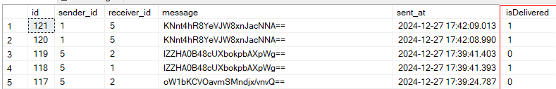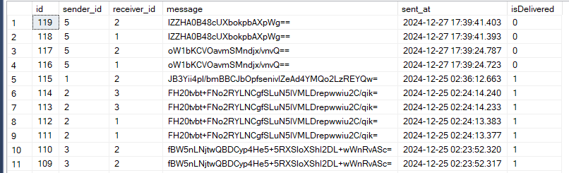 Burada database’nin bir görüntüsünü görebiliriz, burada mesajlar şifreli bir şekilde database’de tutuluyor, mesajın ne zaman gönderildiği ve teslim edilip edilmediği sütunlarını içeriyor. AES şifreleme metodu kullanılmıştır, kırılması zor olduğu için bu kriptoloji metodu tercih edilmiştir.