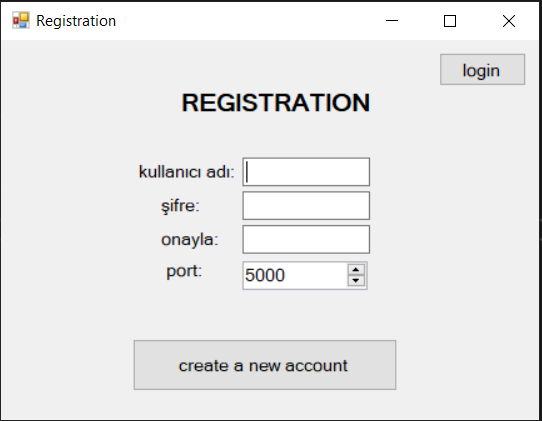 - Kayıt Ekranı: Kullanıcılar, kullanıcı adı, şifre ve dinleme portu bilgileriyle yeni bir hesap oluşturabilir. Varsayılan olarak 5000 portu seçilmektedir.