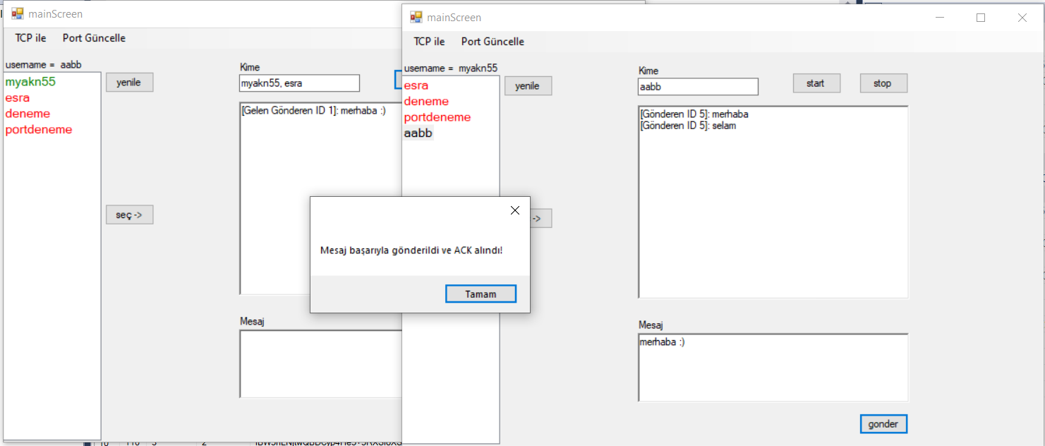 Eğer kullanıcı online ise burada izlenecek yol TCP ile mesaj gönderimidir. Burada TCPlistener ile client start butonuna basarak bir portu sürekli dinlemeye alırız. Karşı taraf mesajı göndereceği ip adresi ve portu zaten users tablosundan çekebiliyor. Eğer karşı tarafın port bilgisi yanlışsa karşı tarafa iletilemediğine dair bir hata mesajı bize geri dönüyor, veya karşı taraf dinlemeyi başlatmadıysa eğer mesaj yine alıcı tarafa iletilemiyor. Eğer mesaj düzgün bir şekilde iletilirse bir ACK mesajı bize geri dönüyor. Ayrıca online bir kullanıcıya mesaj atarsak database’nin messages tablosunda isdelivered sütununun 1 olduğunu görebiliriz.